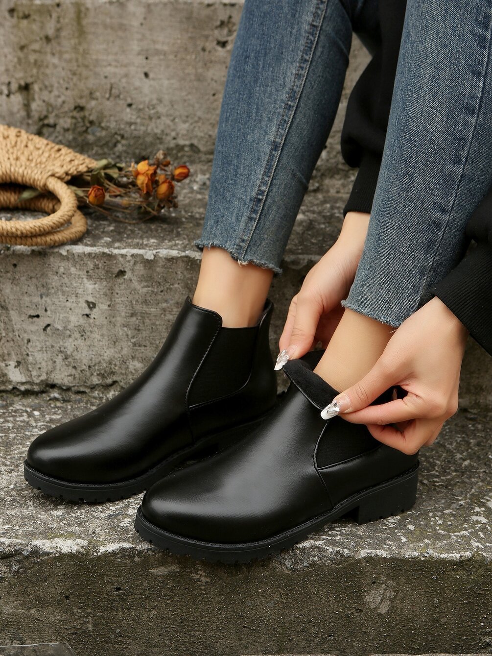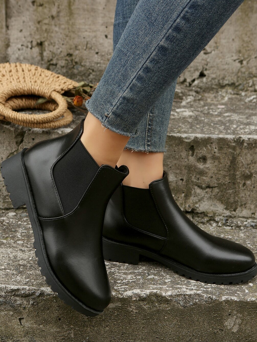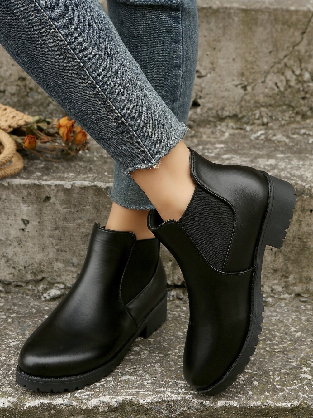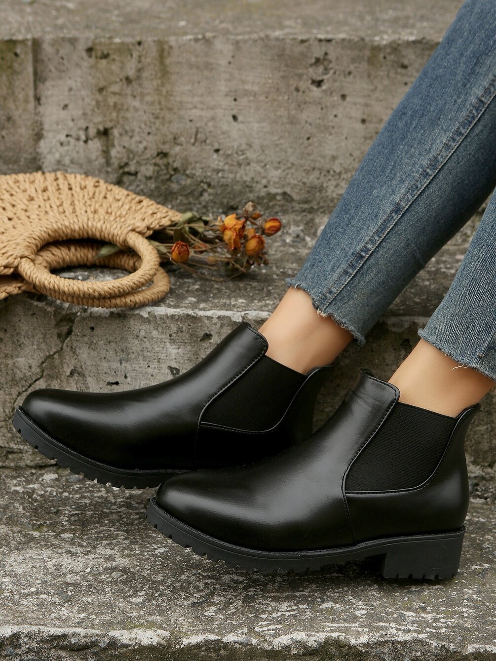 Elegant Black Chelsea Boots For Women, Stitch Detail Point Toe Chunky Heeled Boots