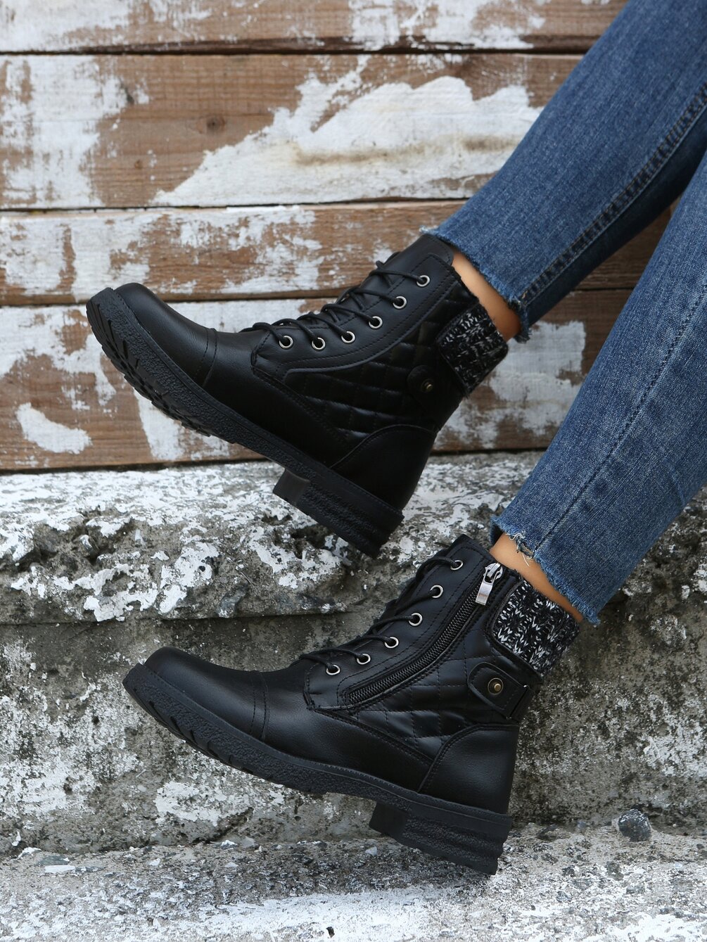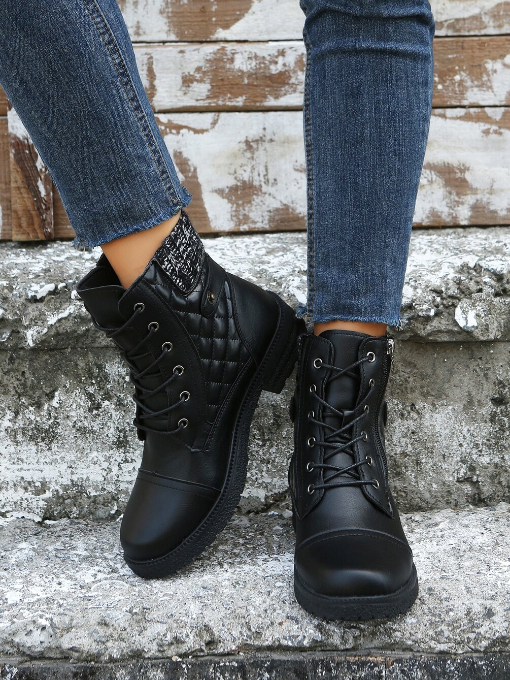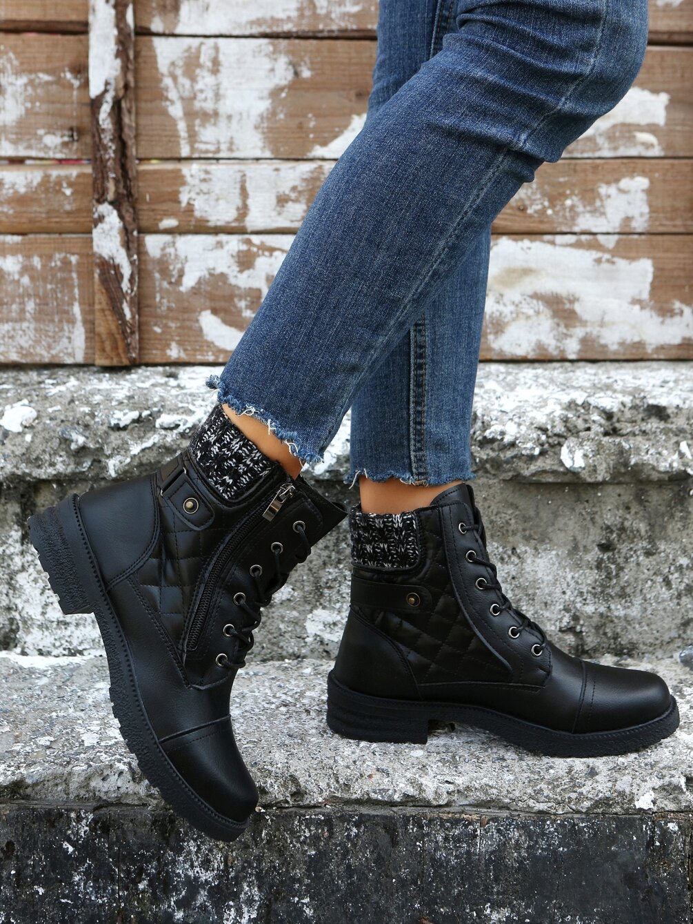 Quilted Detail Zipper Side Lace-up Front Combat Boots