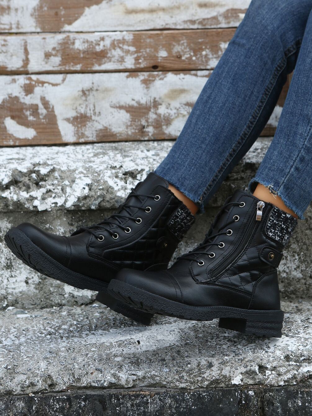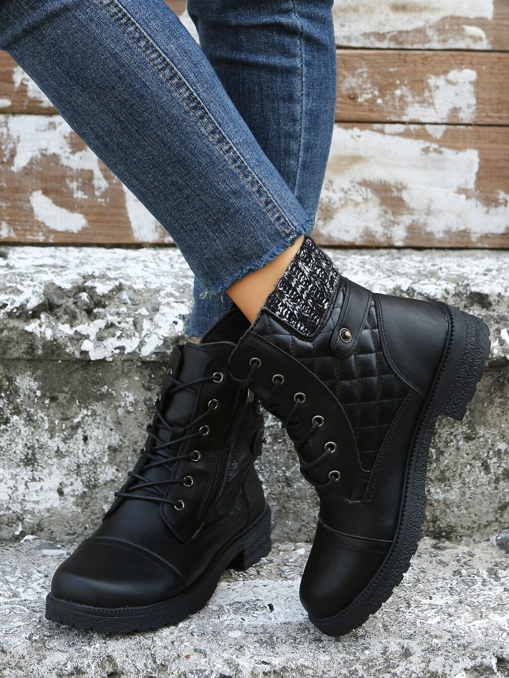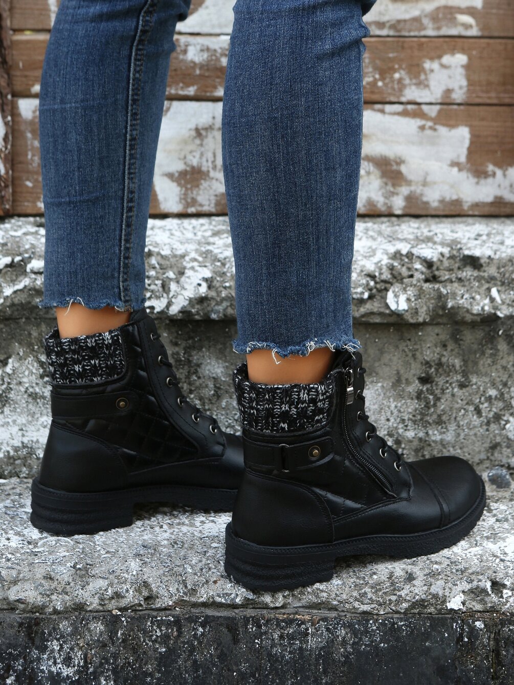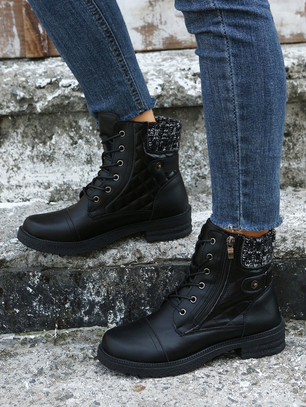 Quilted Detail Zipper Side Lace-up Front Combat Boots